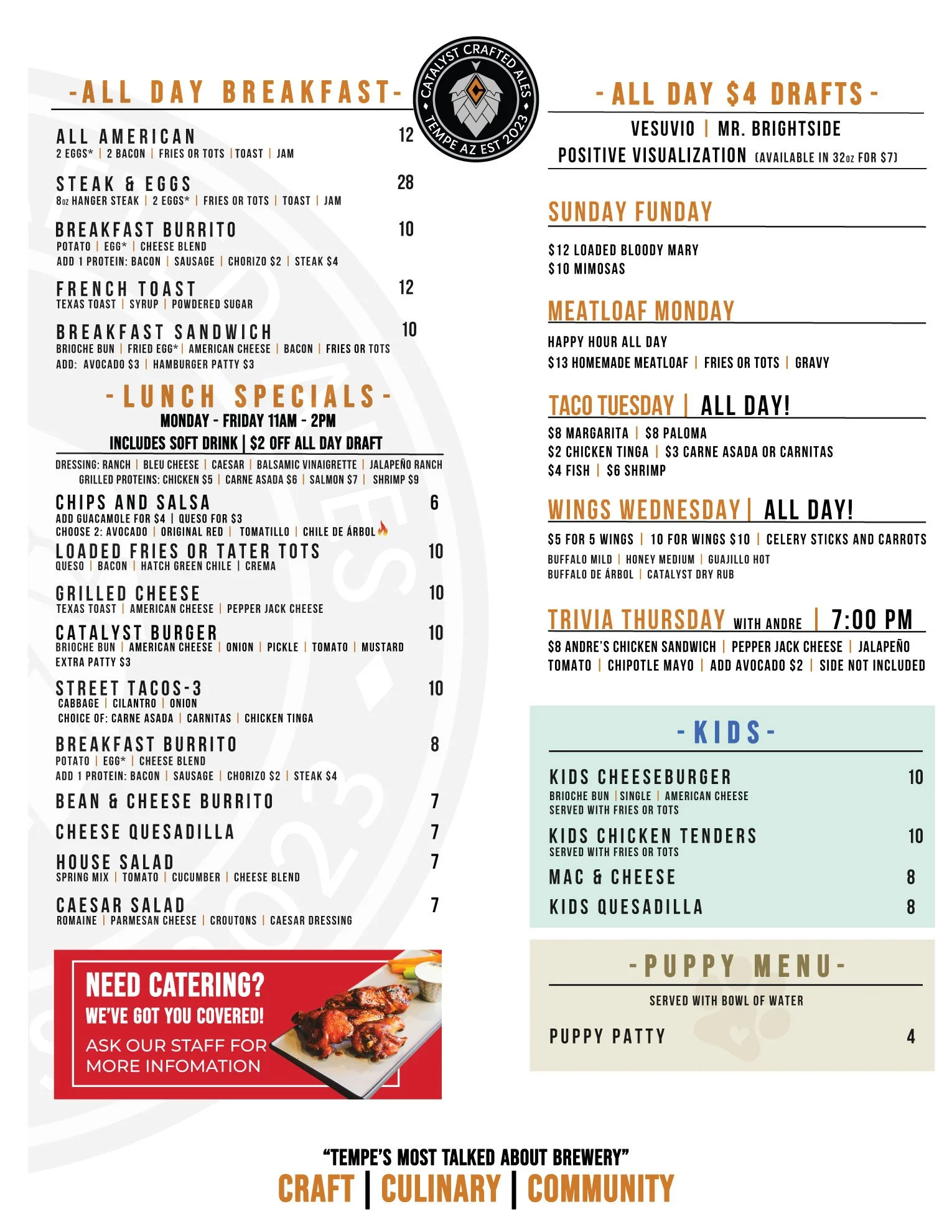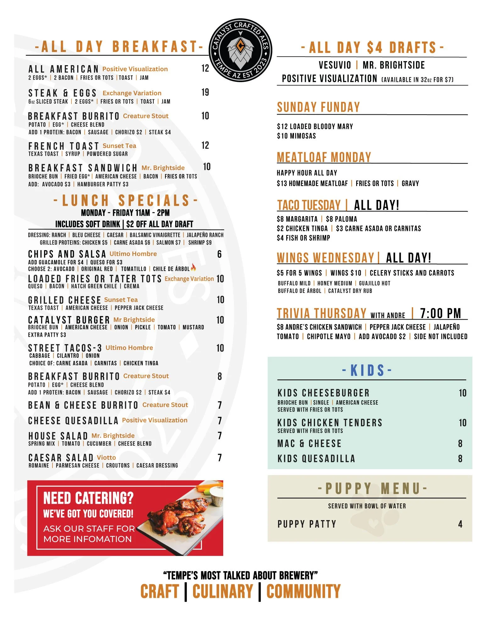 Make your event unforgettable with our catering services at Catalyst Crafted Ales—where great food meets exceptional brews!